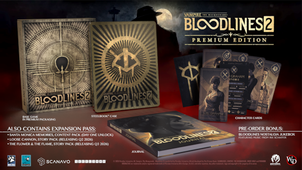 - Vampire: The Masquerade - Bloodlines 2 Premium Edition : jeu de base et l’Expansion Pass, incluant Santa Monica Memories ainsi que les deux Story Packs Loose Cannon et The Flower & the Flame.